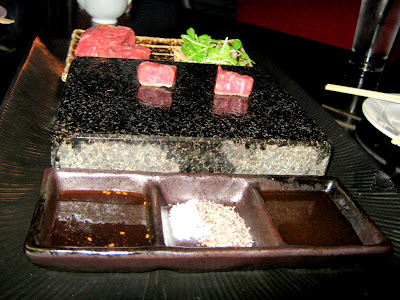 From the right, ponzu sauce, salt and pepper, and I forgot the last one... it was ginger soy sauce or something like that. The waitress used the fat of the meat to smother the stone with oil and then allowed us to cook the meat to our liking. It was melt-in-the-mouth, literally.